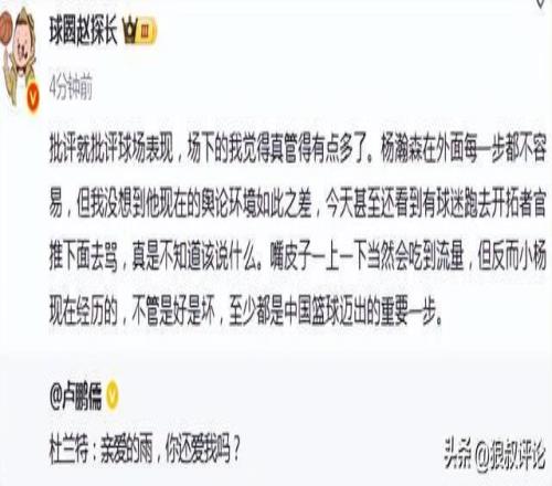媒体人“卢鹏儒”则是发出了各大社媒当中,徐静雨对于杨瀚森输出动态,配文表示:“杜兰特:亲爱的雨,你还爱我吗?”。