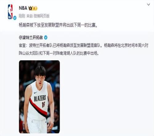 NBA开拓者官宣:杨瀚森被下放至发展联盟,将出战两场比赛